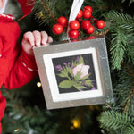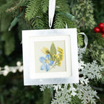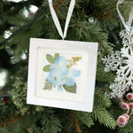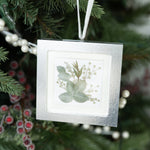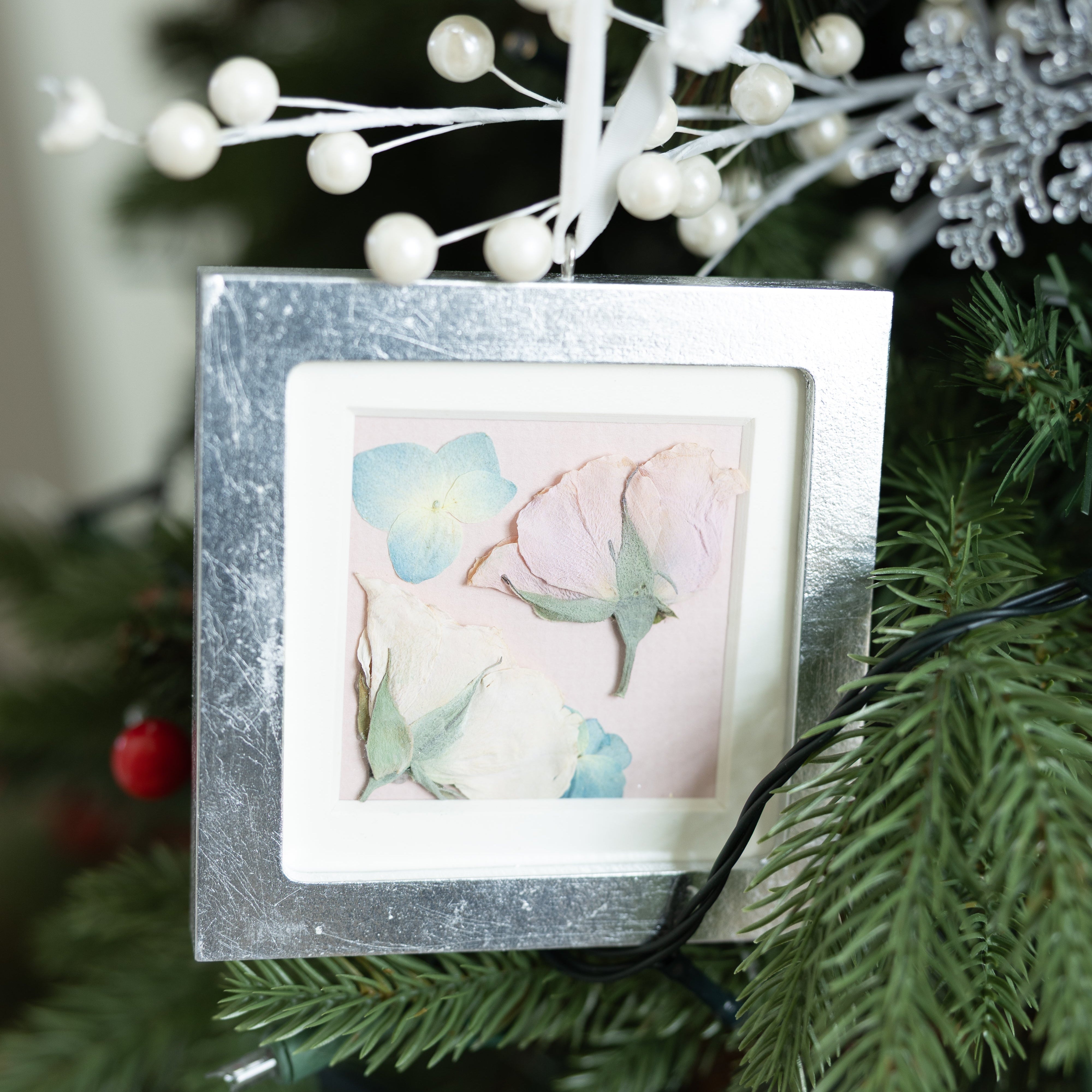 Our pressed flower ornament is a timeless way to showcase a few of your special blooms in a piece that can be enjoyed all year long or displayed beautifully on your Christmas tree. Each ornament is handcrafted using your own flowers, carefully pressed and arranged inside a silver leaf frame for an elegant, elevated look.